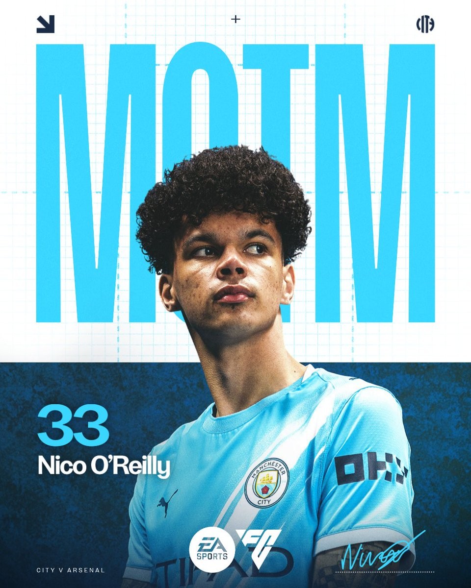 曼城官方:尼科-奥赖利当选与阿森纳一役队内最佳球员